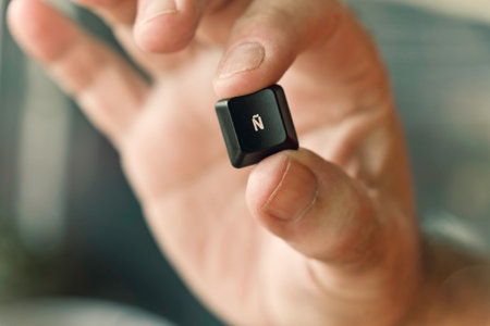 A hand holding a key with the Spanish letter Ñ (N with an tilde) on it. Concept of curiosity and intrigue, as the person is holding the key up to the camera, possibly to show it to someone else or to examine it more closely