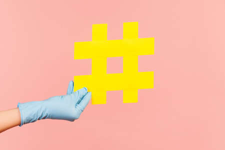 Profile side view closeup of human hand in blue surgical gloves holding yellow hashtag. indoor, studio shot, isolated on pink background.