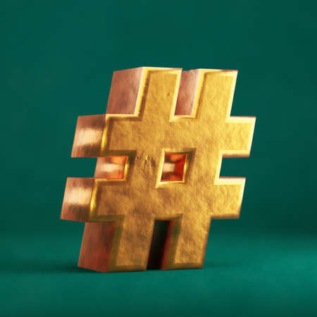 Fortuna Gold Hashtag on Tidewater Green background. Trend color font type symbol. 3d render.