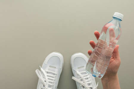 Female hand with a bottle of water, white sneakers and a towel on the floor, doing sports and training in the gym, active healthy lifestyle, top view, copy space