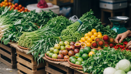 Fruit market with various fresh greenery and vegetables. Generative AI content