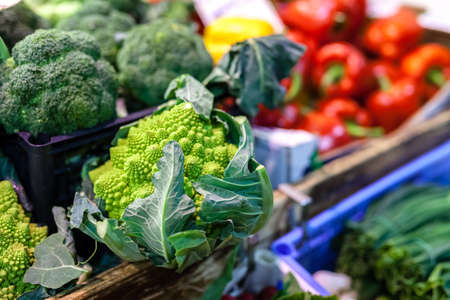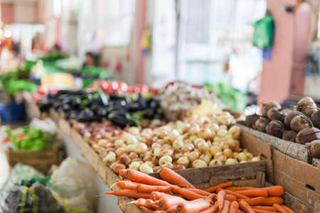 Mixed fresh vegetables laying to be sold in the market, shallow depth of field
