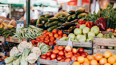 A vibrant farmers' market stall with a colorful array of fresh vegetables, perfect for promoting organic food, sustainability, and local farming.