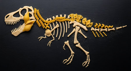 Dinosaur skeleton created with food art using pasta bones. Creative T-Rex composition illustrating paleontology of extinct Jurassic.