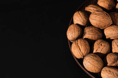 Walnut in wooden bowl on black background with copy space.Top view. Wooden plate with walnut on black background. Space for text