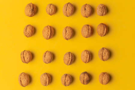 Background of nuts arranged in rows with a yellow background.