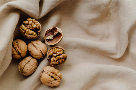 Walnuts on a beige fabric background, top view. Copy space.