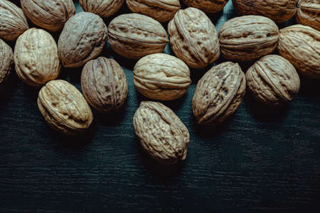 A walnuts heap close-up. Copy space. Beautiful still life on a dark background. Healthy food. Ingredient. Useful brain nutrients. Nut is a tasty diet snack. Brown color. Wallpaper. Photo art. Banner.
