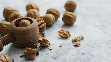 Composition of wooden cracker for nuts with heap of walnuts in shells on marble table