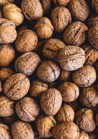 Close up pile of walnuts for background. Selective focus