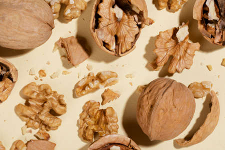 Walnuts on mustard background. Walnuts whole and open.