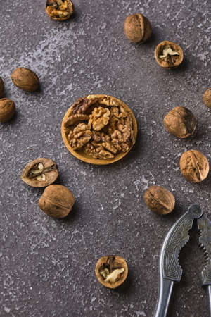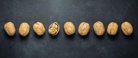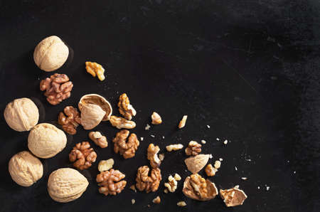 Walnuts on a dark concrete background. Nuts are a source of vegetable protein and vitamins. Flat top view, copy space.