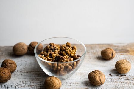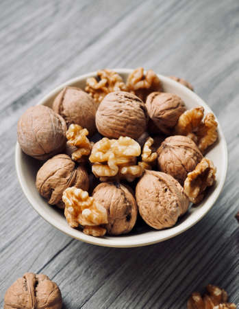 Walnut in a smale plate with scattered shelled nuts and whole nut which standing on a wooden vintage table. Walnuts is a healthy vegetarian protein nutritious food. Walnut on rustic old wood.