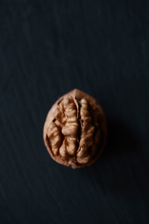 Walnut kernel on a slate backdrop. Healthy raw snack or organic vegetarian meal ingredients.