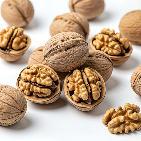 A detailed studio shot showcases walnuts, both whole and cracked open, revealing the delicious kernels. The composition highlights the textures and colors of the nuts against a clean white backdrop, emphasizing their natural beauty.