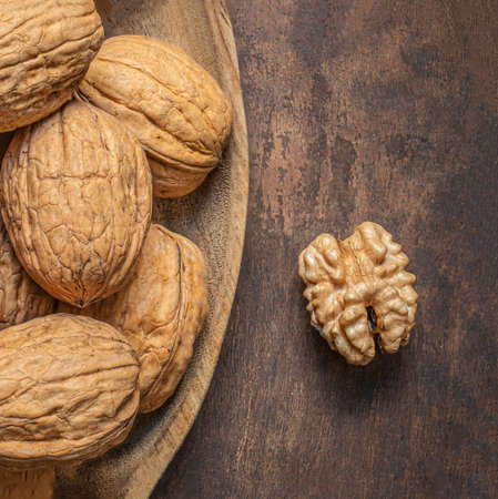 Walnuts. Nuts on a dark wooden background. Very useful fruits for the brain.