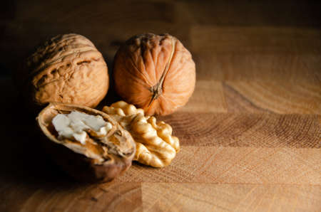 Walnut kernels and whole walnuts on rustic old oak table.Walnuts in a shell