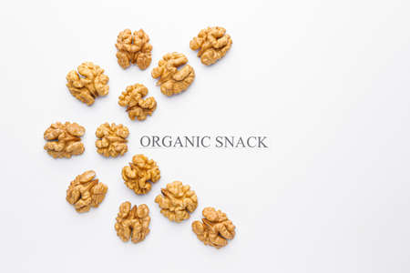 Tasty walnuts with text ORGANIC SNACK on white background