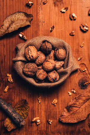 Walnuts in autumn decoration on the table.
