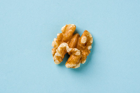 Top view of half walnut kernel on blue background