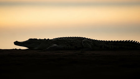 A crocodile is silhouetted against a soft yellow sunset sky as it lies on the ground.