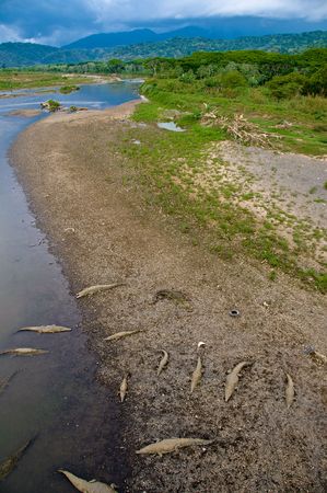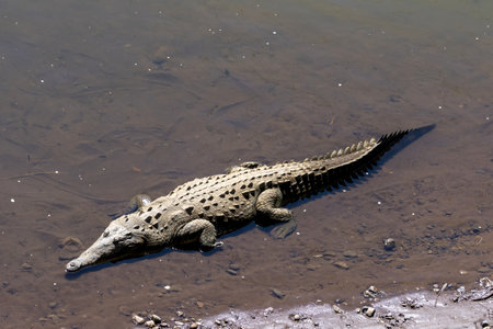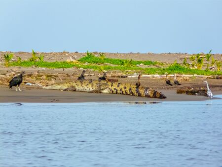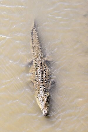 Crocodiles are swimming and sunbathing in the river Tarcoles.