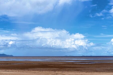 White fluffy clouds in a clear blue sky over a tidal beach with the water receded