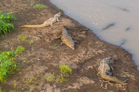 Crocodiles in the wild in Costa Rica, basking on the edge of a river