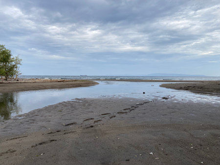 beautiful sunrise on a muddy beach. Dawn ambience on a beach with dramatic sunrise view