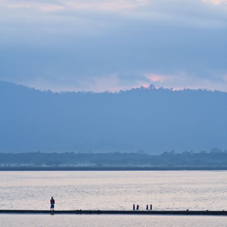 Silhouette man watching the sunrise over lake