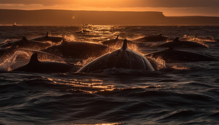 Majestic humpback whale silhouette splashing in blue seascape at dusk generated by artificial intelligence