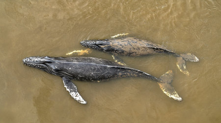 Two humpback whales glide gracefully through shallow water, displaying natural beauty and serene movements, highlighting the importance of marine conservation efforts in their habitat.