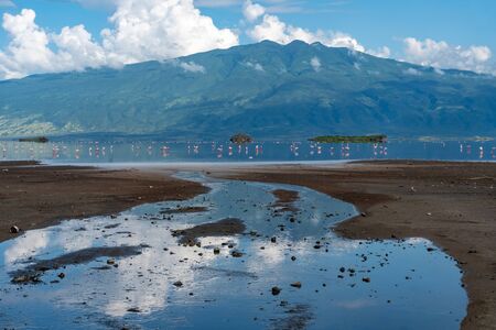 Pink lesser Flamingos at Lake Natron with Ol Doinyo Lengai volcano on background in Rift valley, Tanzania