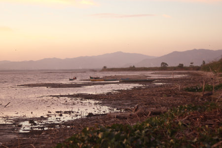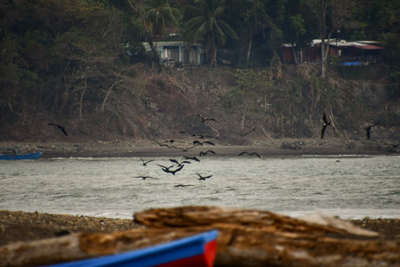 Evening view of the Pacific Coast in Tarcoles, sunset, glittering waves and fisherman boats. Idyllic sunset landscape. Tarcoles, Costa Rica. Pura Vida concept, travel to exotic tropical country.