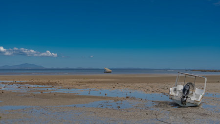 Low tide in the ocean. A motorboat tilted on the exposed sandy seabed. Puddles of water. There's a sailboat in the ocean. Mountains on the horizon. Clear blue sky. Madagascar.