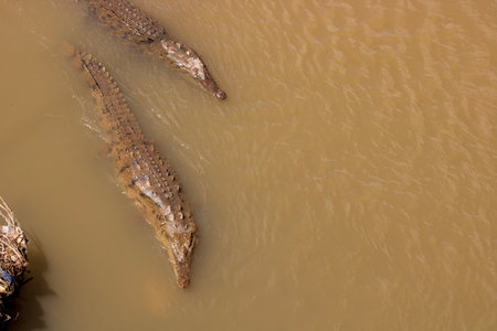 Manuel Antonio National Park, Costa Rica; 08202007: Aerial view of crocodiles in the river, next to the riverbank. Muddy water.