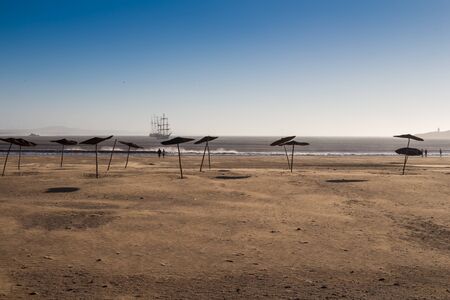 Sandy beach, with several people in the backlight. Many wooden umbrellas. Early evening of the autumn, out of season. Atlantic ocean with boats in the background. Essaouira, Morocco.