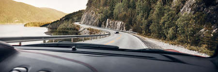 Road trip to Norway, driving on highway along beautiful high snowy mountains, traveling to Europe, freedom and adventure concept..
