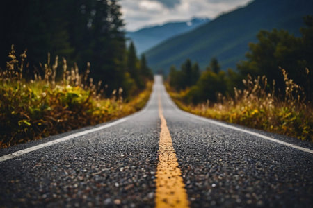 Close-up of a yellow asphalt road with black pavement and red rocks in the background on a sunny day, a road trip concept. The blue sky, bokeh effect, and depth of field create a boho-style, symmetrical composition in a flat lay shot with a blurred background and low-angle view of the desert landscape. The close-up of the yellow line on the highway is set in the Nevada mountains. --chaos 30 --ar 16:9 --v 6.1 Job ID: e93427f1-a04e-4c98-b2e2-deb25e687d05