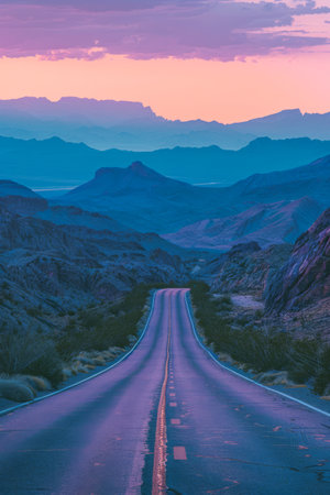 Dramatic sunset view over an empty desert road with vibrant colors and textures. The asphalt stretches into the horizon, inviting exploration and adventure.