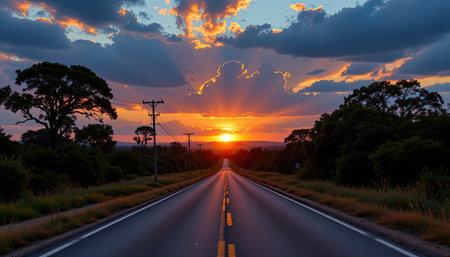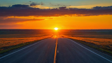A mesmerizing view of a straight road leading towards a vibrant sunrise, showcasing the interplay of light and landscape while inviting a sense of adventure.