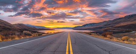 Dramatic sunset view over an empty desert road with vibrant colors and textures. The asphalt stretches into the horizon, inviting exploration and adventure.