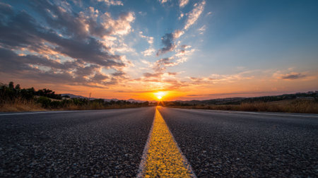 An asphalt road extends into the distance, framed by hills and illuminated by a setting sun. The composition features a low-angle perspective, highlighting the road's texture and the natural gradient of the sky. The warm colors suggest a tranquil outdoor setting, suitable for commercial or editorial applications.