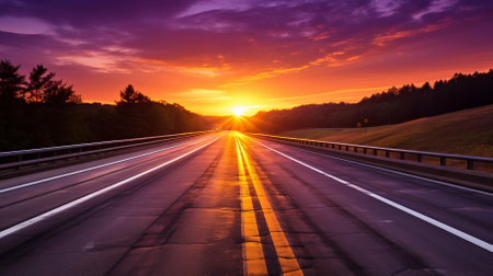 AI generative. Road leading into a sunset. Road through the scenic landscape to the destination