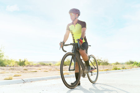 Caucasian male athlete taking break outdoors during morning cyclist. Positive young man sitting on bike and looking aside. Favorite sport hobby.
