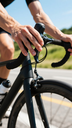 Close-up of male hands holding bicycle handlebar on the road