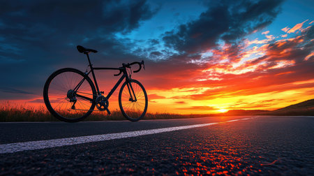 a close-up, uhd image of a bicycle parked on a street with a stunning sunset in the background. the vibrant colors of light crimson and red create a youthful and energetic atmosphere. this landscape-focused photo captures the detail-oriented beauty of the scene. get ready to experience the rtx on effect with this captivating image. ai generated