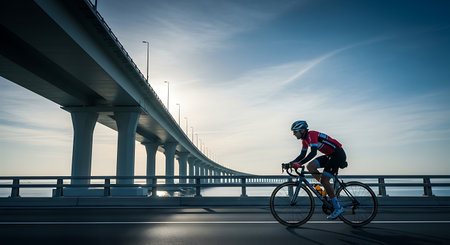 A male cyclist in athletic gear rides a road bike across a long, modern bridge at sunrise, with the sun casting a warm glow and creating reflections on the road surface.