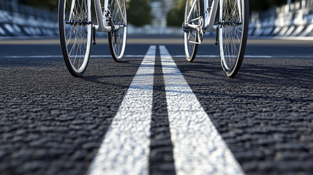 This captivating image features a close-up of bicycle wheels resting on a freshly painted lane, showcasing dual white lines against an urban backdrop, perfect for cycling enthusiasts.