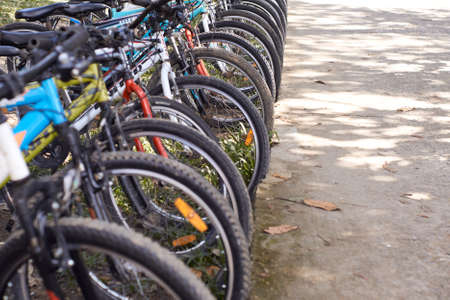 Bicycle rental for entertainment and outdoor recreation. Bicycles for cross-country trips. Bicycle parts close-up. Soft focus. Weekend in nature for the whole family.